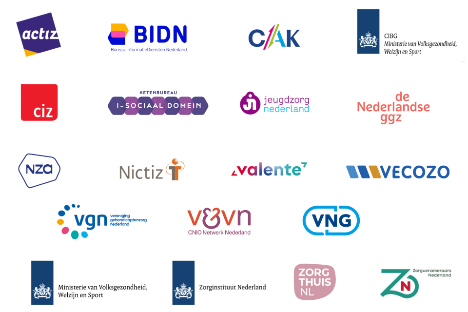ActiZ, BIDN, CAK, CIBG, CIZ, Jeugdzorg Nederland, Ketenbureau i-Sociaal Domein, de Nederlandse ggz, Nederlandse Zorgautoriteit (NZa), Nictiz, Valente, VECOZO, VGN, VNG, V&VN, Ministerie van VWS, Zorginstituut Nederland, Zorgthuisnl en Zorgverzekeraars Nederland.